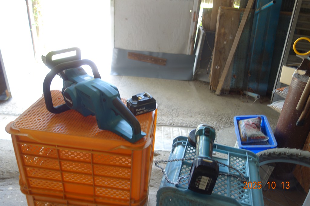 チェーンソの刃の交換・オイルの点検など済ませる。