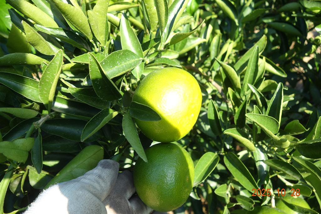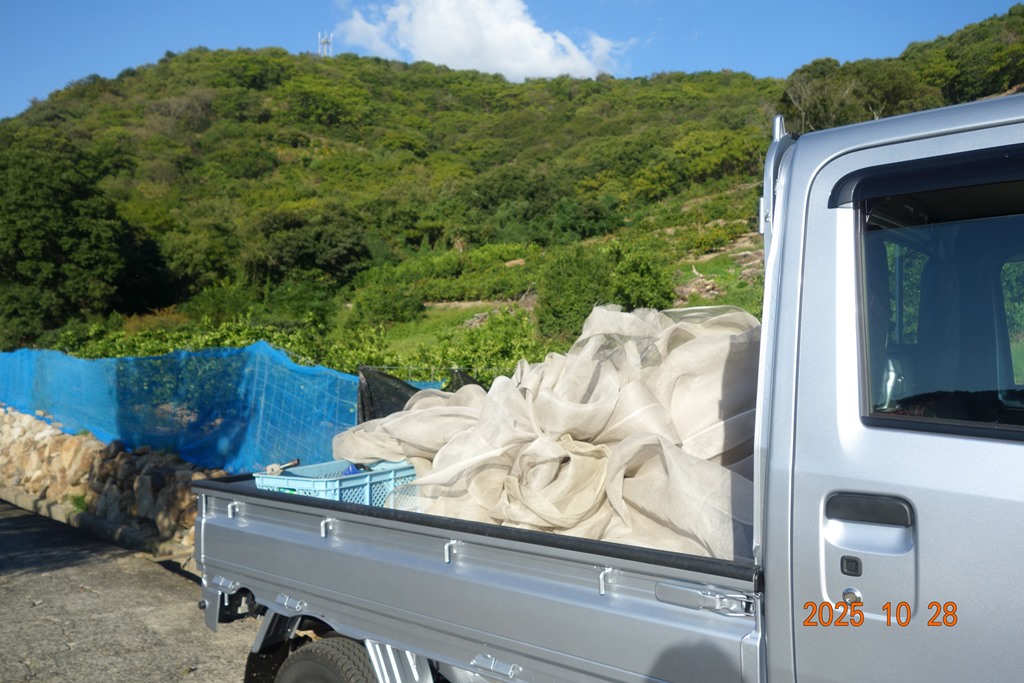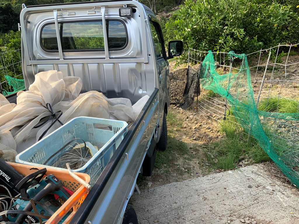 収穫前の準備作業いろいろ。 池に近い園地をイノシシが掘り起こしているのを発見。 せとかの日焼け防止シートを撤去。 日焼け果が少ない。 皮が滑らかです。