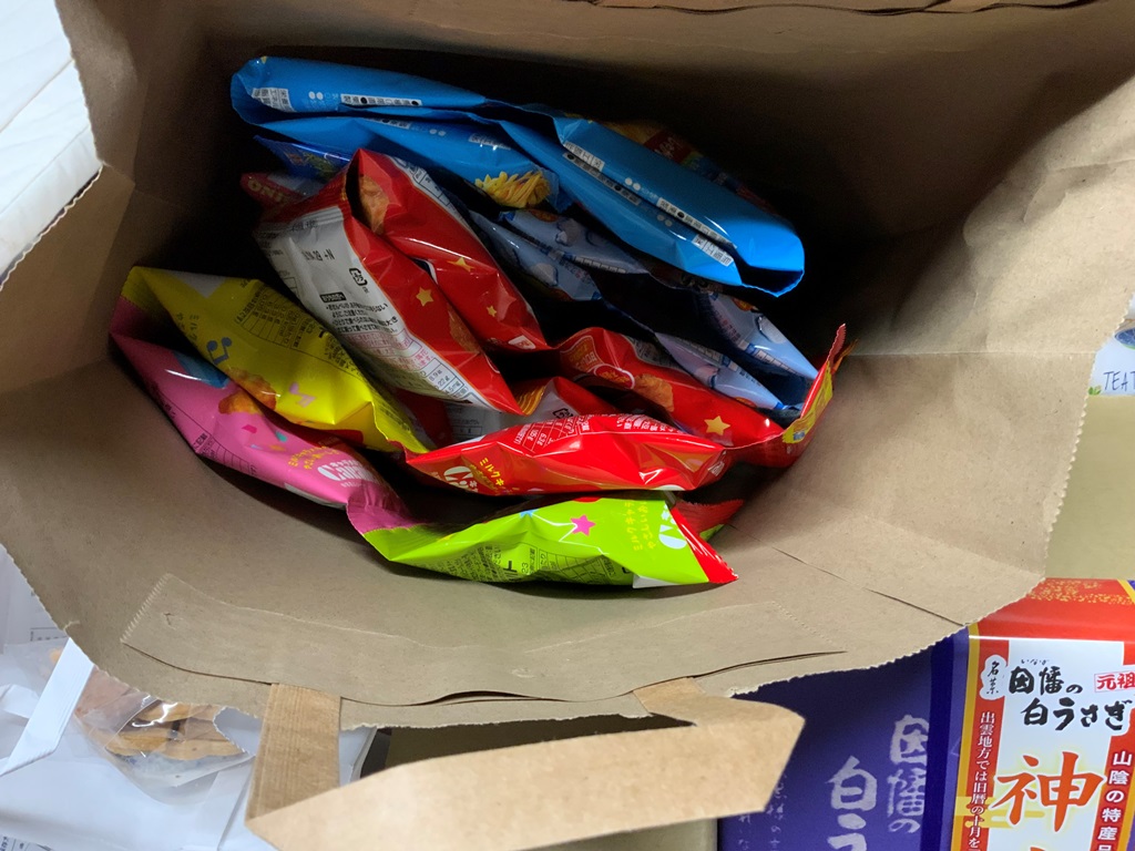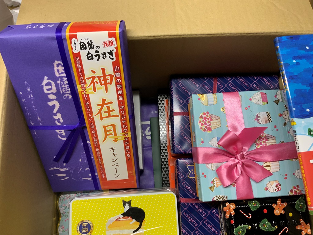 一週間納屋で保存し出荷。 ・ ・ 出張先の長女から送ってきた菓子類。 お気遣いありがとう、早速使わせてもらいました。 毎回孫達にも。